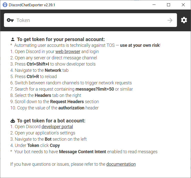 The program then starts and a window pops up asking for an API token. I have had to use API tokens in the past, and gist is that they are a substitute for login credentials. While this tool requires a token in order to view your joined servers, if a malicious actor were to get this token they could steal your account. This is why you should be careful giving this information away. The description below should work for Chromium-based browsers but for the Firefox instructions (also with pictures) can be found here.