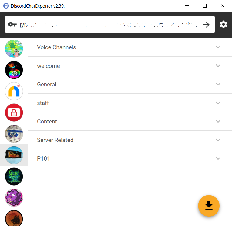 Once you enter your API token you should see the following screen. The servers you have joined are on the left, and you can click on them to show the channel groupings. Clicking on the groupings shows individual channels. From there you can download them by selecting one or, while holding the CTRL key, selecting multiple and then the yellow button.