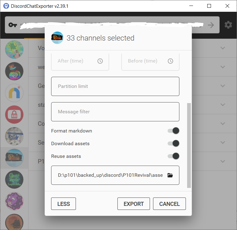 Doing so will bring up a download menu. There are several different options to choose from, including the output format and whether to download attachments. After a few attempts I opted to save JSON data because for some reason there is much more data fetched this way than using a CSV or HTML. I also decided to download attached images such that I would not have any broken Discord links, but this added a considerable amount of download time and hard drive space.